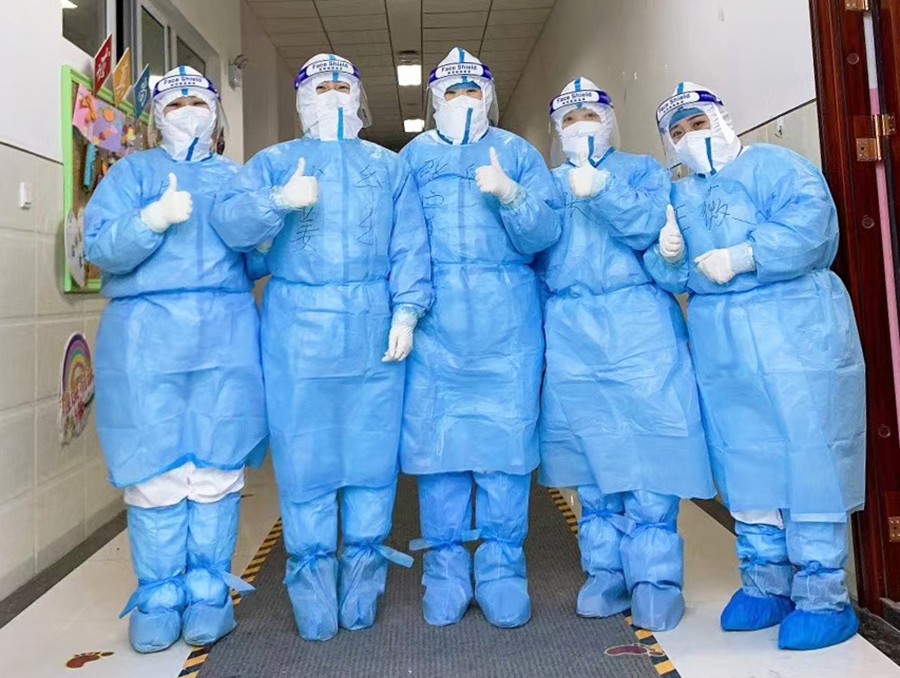 这几天,参与检测的医护人员基本都是“早六晚十”的作息,一般夜里十二点才能到达休息处。在采样队伍里,95%的队员都是女同志,穿上防护服,一站就是十几个小时。