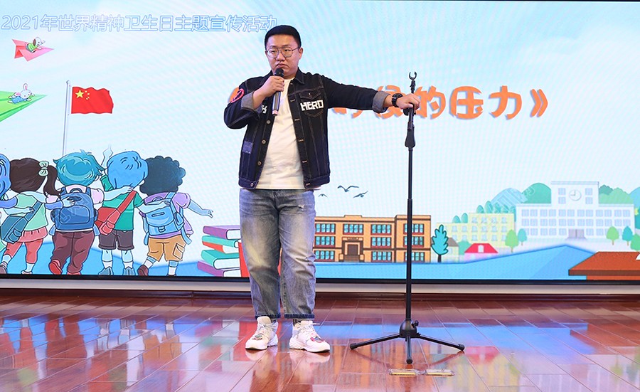 齐齐哈尔医学院精神医学专业学生姜帅为大家带来了一段脱口秀表演——《我小时候的压力》。表演者将他小时候的成长经历以情景故事再现的形式讲述给大家,并提示大家在成长的过程中要学会适当释放压力。