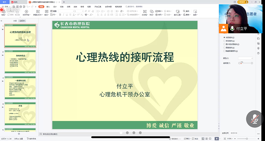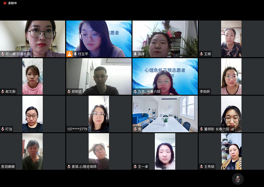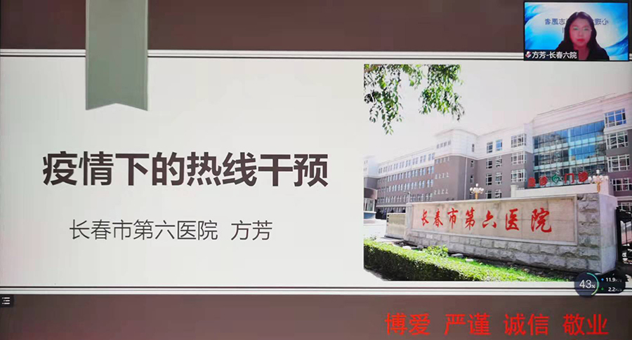 此次培训由长春市心理危机干预中心主任医师郑晓华、心理危机干预中心主任方芳、资深热线心理咨询师刘洋和付立平进行授课。培训的主要内容包括:心理危机干预、疫情下的热线干预、心理热线接听技术及系统操作流程、心理热线咨询师自我照顾与咨询伦理、热线案例模拟实操演示等内容。