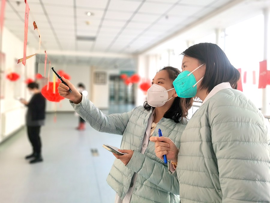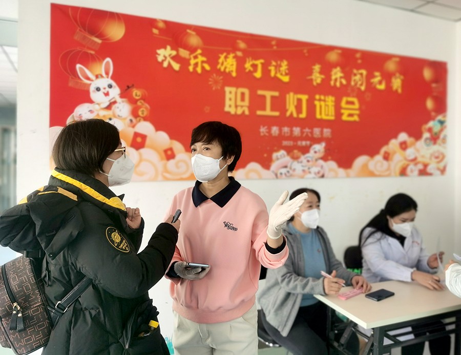 在医院五楼多功能厅外的长廊上,早就悬挂起数百个灯谜条静待大家猜度。活动正式开始前,五楼的“谜海”里早已人头攒动,对谜处等待核对答案的人也渐渐排起了长队。此次数百个灯谜除了涵盖字谜、成语谜、物品谜等常见的谜语类型外,还设置了脑筋急转弯、趣味天文学谜语、军事灯谜等紧跟时代步伐的新型特色灯谜。谜面有易有难,猜不出的人急忙找伙伴仔细推敲谜底,活动现场欢声笑语不断、热闹非凡。