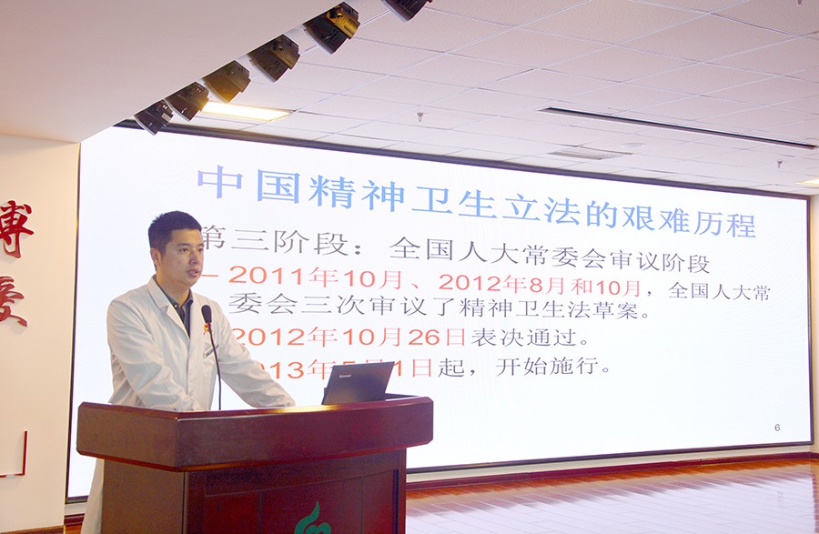 活动伊始,伦理片 副院长董勇带大家一起了解了《精神卫生法》,讲述了中国精神卫生立法历时27年的艰难历程,阐明了《精神卫生法》在维护精神障碍患者合法权益中发挥的重要意义。随后,他逐一解读了与大家息息相关的主要法律条目。