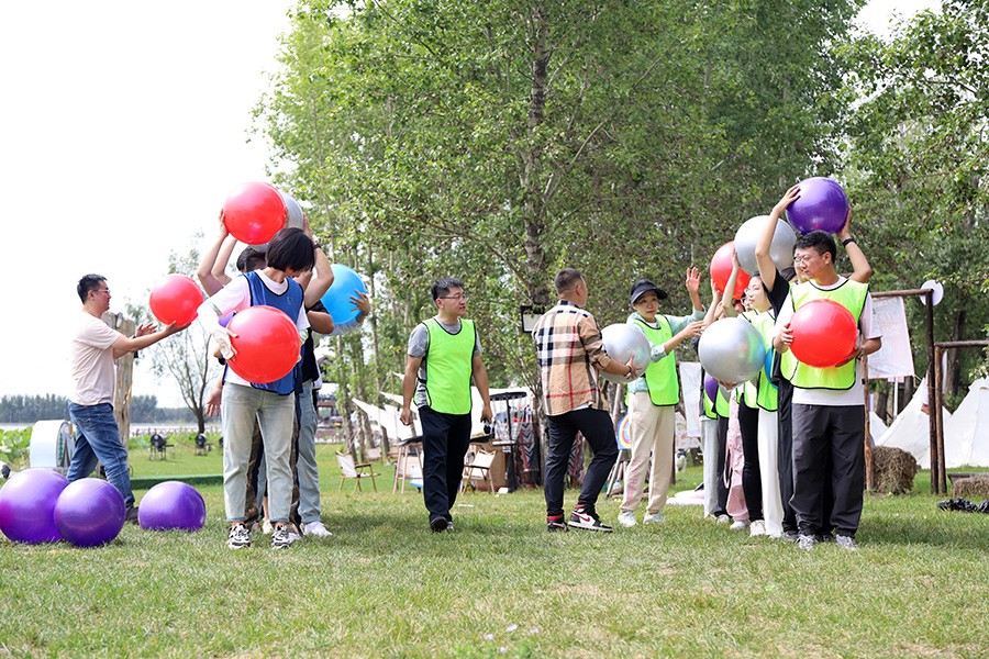 同心击鼓振人心:同心击鼓是一个考验团队默契和个人发力稳定性的项目。大家紧紧拉着牵引绳,尽力让鼓保持在一个平面上,“1……2……1……2……”齐声喊着口号,8个、9个、10个,大家将眼神专注在球上,手上小心翼翼地发着力。