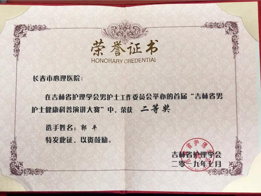 7月20日,在吉林省护理学会男护士工作委员会举办的首届“吉林省男护士健康科普演讲大赛”上,伦理片 精神科三疗区男护士郭平的科普演讲《与抑郁者共情》感染了全场的听众,在初赛36名选手中以总分第二的优异成绩冲入决赛,最终在决赛上荣获二等奖。