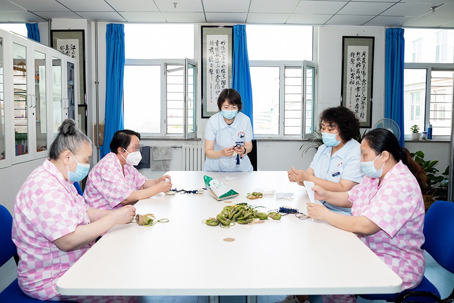 “戴个香囊袋,不怕五虫害”。作为中华民族传统节日,端午节一直是避瘟驱毒、祈求健康的民俗佳节。为了让与病魔抗争的在院休养员感受到爱与祝福的同时,也能够体会到中医药传统文化魅力,中西医结合疗区医生依据专门药方,特别调配了具有芳香化浊、提神醒脑等功效的祈福香囊。她们按比例将各种中草药混合在一起,用小勺装入辅料包中,缠紧包口后,转交给在康复科进行日常作业治疗的休养员,完成最后一步的包装制作。