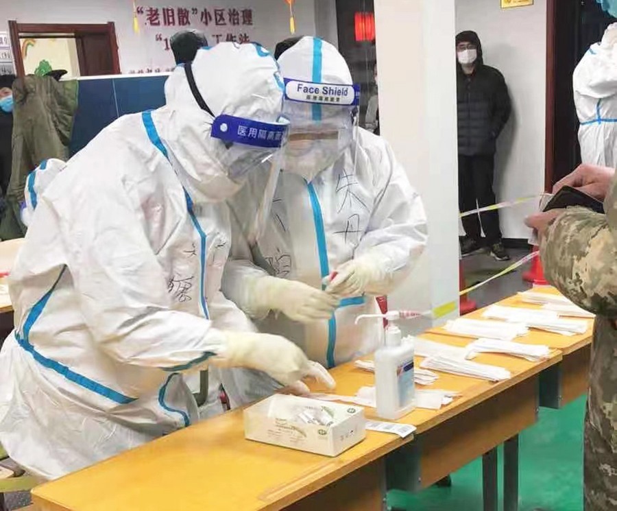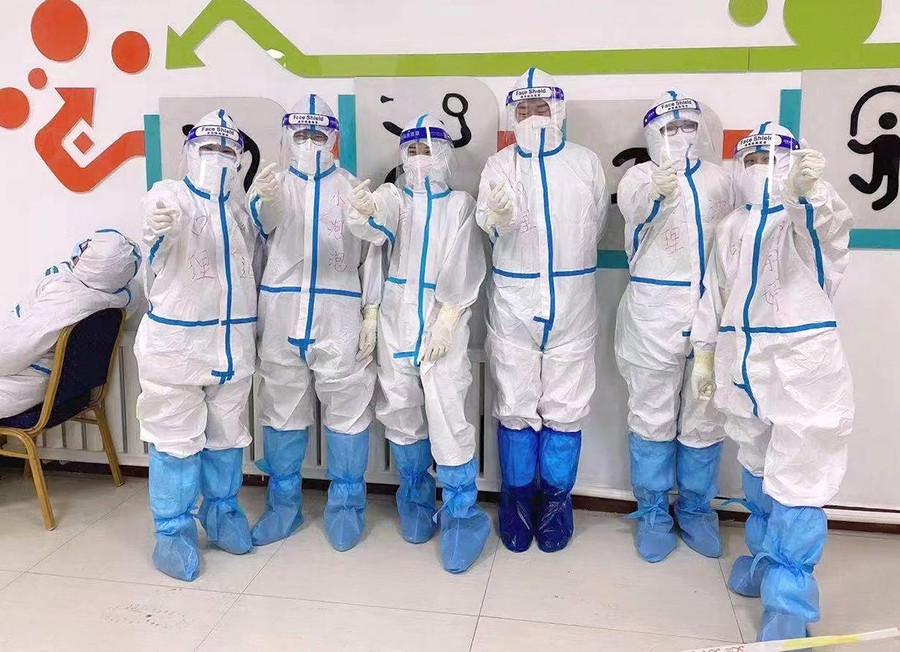 这几天,参与检测的医护人员基本都是“早六晚十”的作息,一般夜里十二点才能到达休息处。在采样队伍里,95%的队员都是女同志,穿上防护服,一站就是十几个小时。