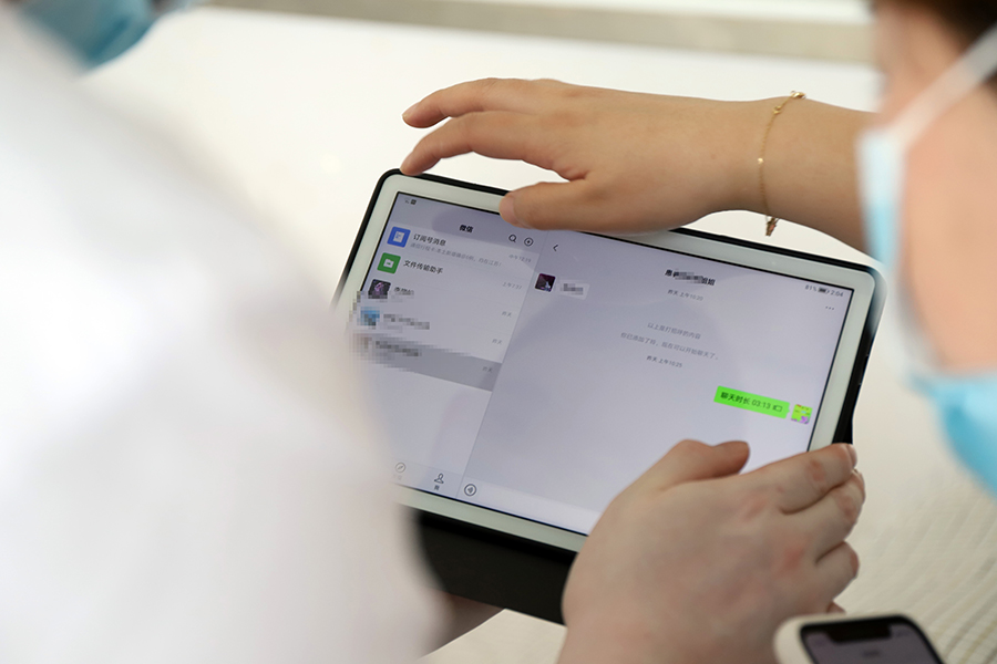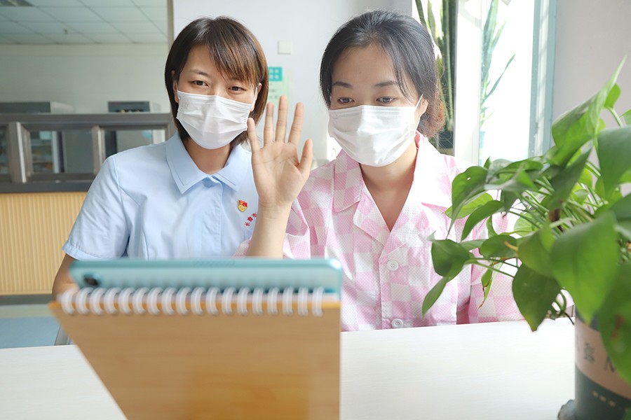 彩云(化名)是一位精神分裂症患者,由于疫情防控,入院后有一段时间没和儿子见过面了,这让她非常焦虑,总叨咕着要回家看看儿子。由于彩云正处于治疗的关键阶段,面对她的状况,疗区决定通过“远程探视”让彩云和儿子“见面”。在医生和护士的陪伴下,彩云终于通过视频和儿子见了面,她脸上绽放出了久违的笑容。虽然只进行了10分钟的“远程探视”,但有效地缓解了彩云的焦虑,让她恢复到积极治疗的状态中。彩云的儿子高兴地说:“没见到我妈之前我还有点担心她,现在好了,有这么方便的‘远程探视’,这回我可真是放心了。”