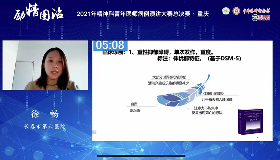 12月22日,总决赛在重庆启幕,12名来自全国各地的优秀青年医师进行了激烈地角逐。徐畅因为特殊原因不能到现场参加比赛,选择线上比赛的方式。她以《谁动了我的睡眠》为题,进行了精彩的病例演讲,剖析了一例抑郁症共病不宁腿综合征的临床病例,从不同角度分析了可能引起失眠的精神问题,开拓了诊断治疗的思路。
