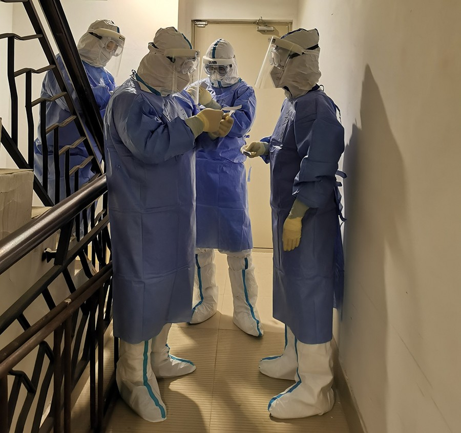 3月19日晚,团队被紧急调离,转战城开美御隔离点。主要负责密接隔离人员的接收、解除、群建立管理、药品物品配发、协助送餐,隔离人员房间布草,阳性病例转运;隔离人员和工作人员信息建立上报、健康监测、核酸采样,三脱间消杀,医用垃圾处理等管理和服务工作。虽然工作琐碎繁杂、风险大,但大家不惧不退,全力做好每一项工作,确保这里的工作一切顺利。