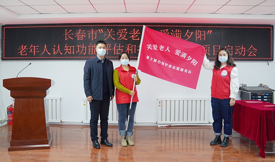 长春市“关爱老人·爱满夕阳”老年人认知功能评估和抑郁症筛查项目将由长春市春之翼志愿者协会共同参与开展。会上,董勇副院长为春之翼心理护老志愿服务队授旗。