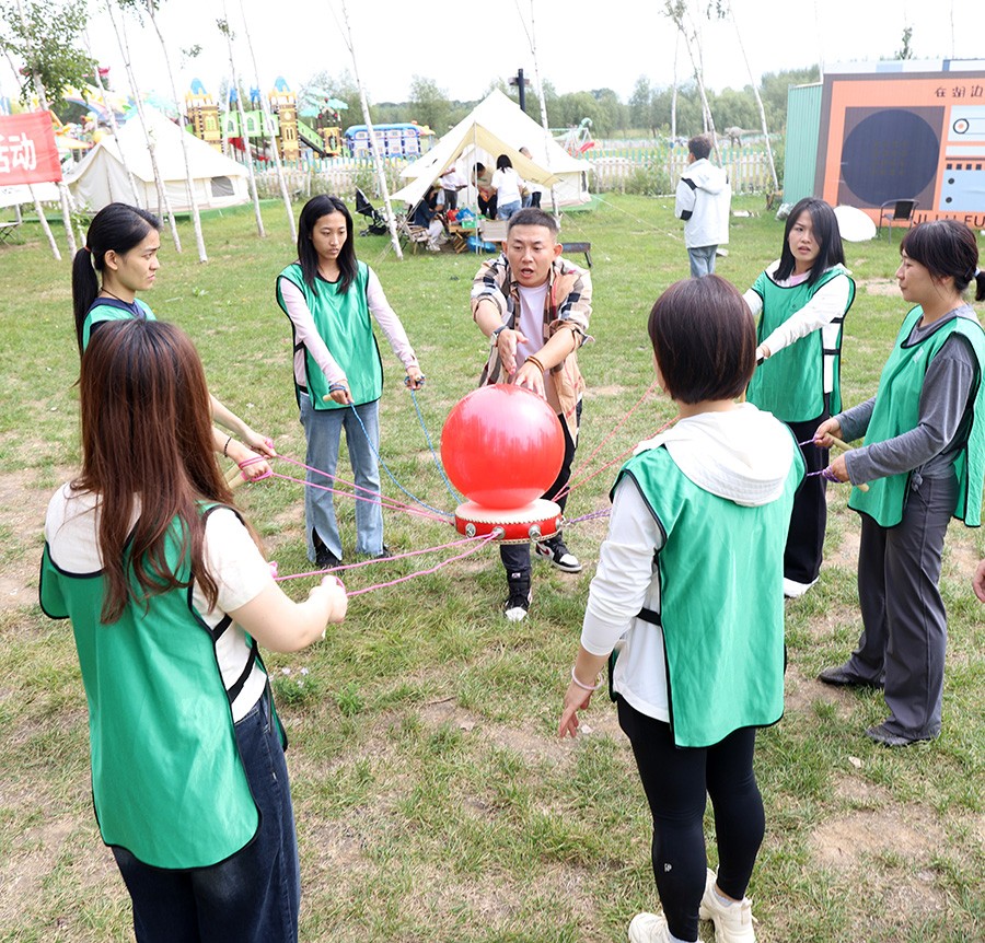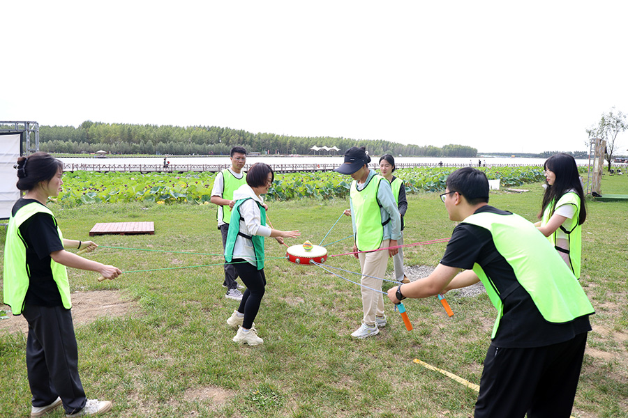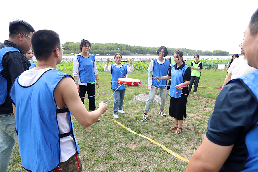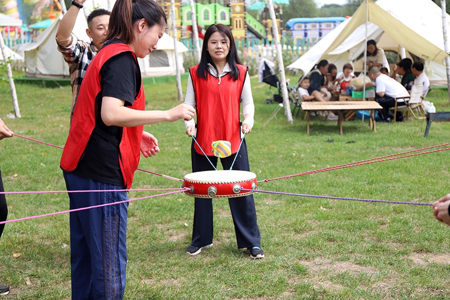 同心击鼓振人心:同心击鼓是一个考验团队默契和个人发力稳定性的项目。大家紧紧拉着牵引绳,尽力让鼓保持在一个平面上,“1……2……1……2……”齐声喊着口号,8个、9个、10个,大家将眼神专注在球上,手上小心翼翼地发着力。