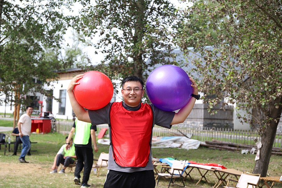 凝心聚力向终点:这项比拼考验相邻两名队员之间的协调能力,以及些许运气成分。大家身夹健身球,稳步走向终点,有经验的队员纷纷表示,这项活动速度并不是唯一要注意的因素。