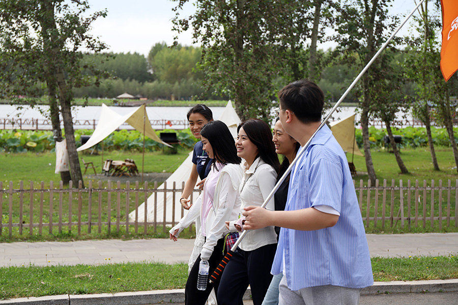 当大家走出车厢,扑面而来是满眼的湖光染翠。吸一口清新的空气,望一眼头顶的蓝天白云,脚踩散发着泥土清香的草坪,微风拂面,格外清爽……每个人的脸上都洋溢着灿烂的笑容,每一步都踏出了健康与自信。